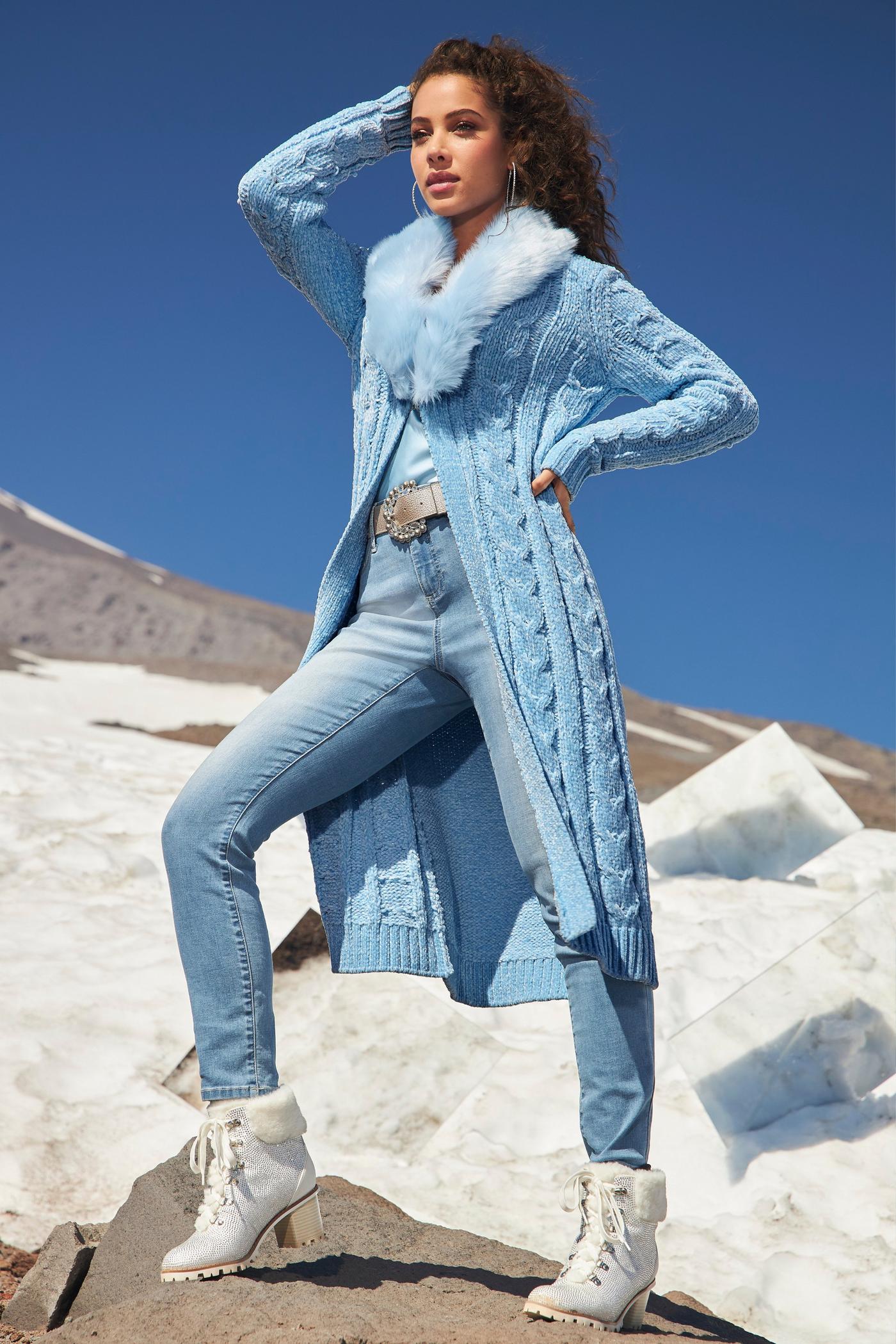 Faux Fur Chenille Duster Sweater Cool Blue Very well made.