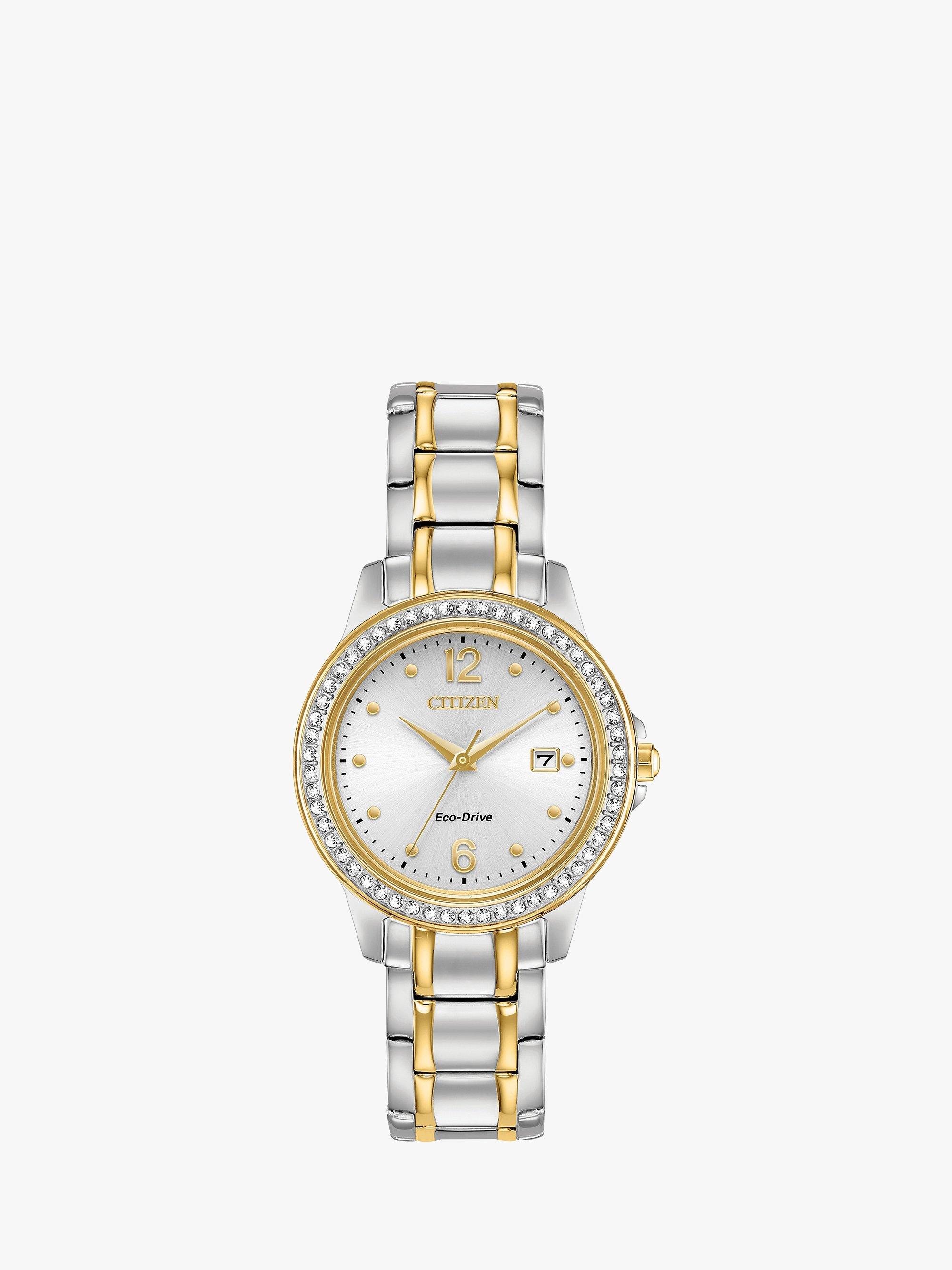 Citizen FE1174 50B Women s Swarovski Crystal Eco Drive Date Bracelet Strap Watch Silver Gold Very well made.