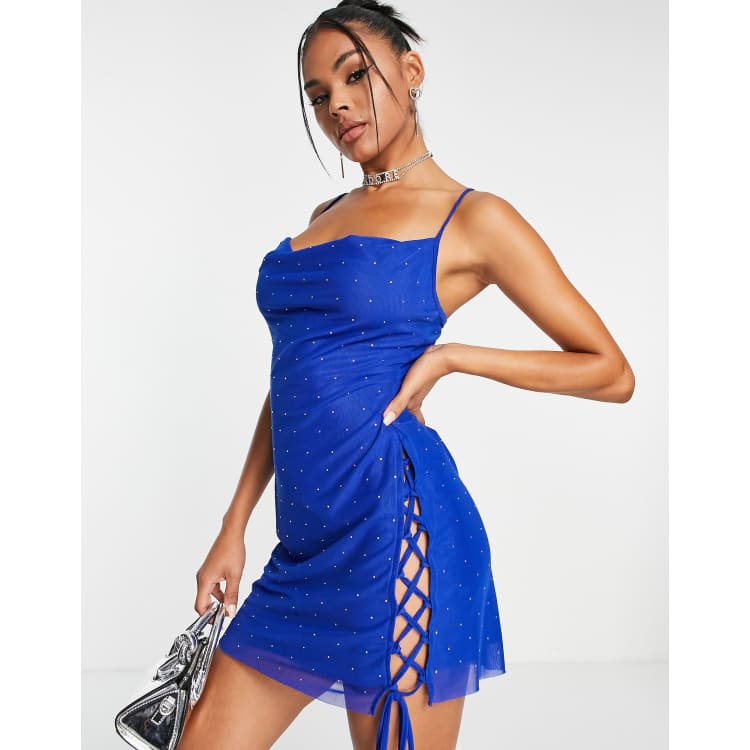 ASYOU diamante hotfix lace up detail mini dress in electric blue ASOS Very well made.