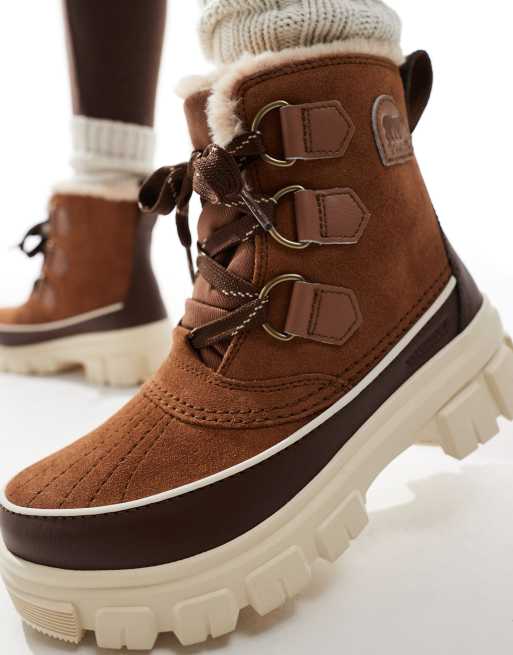 Sorel Torino V waterproof fleece lined faux fur leather snow boots in velvet tan and tobacco Very well made.