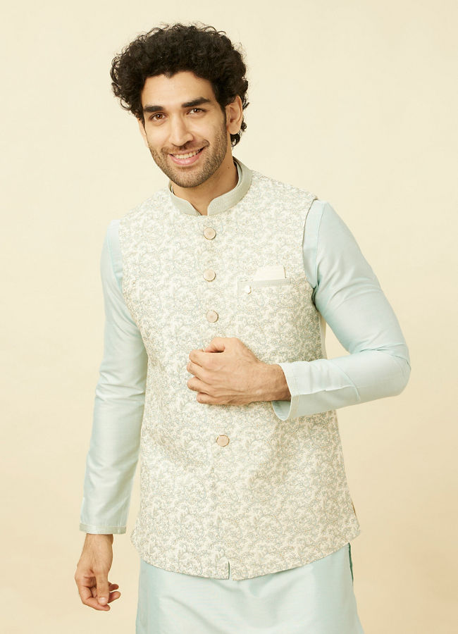 Buy Cream Light Green Bel Buti Patterned Jacket Set Online in Australia Manyavar Kurta Jacket Set for Men Very well made.