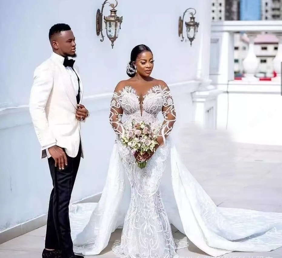 2023 New African Mermaid Slim Wedding Dress Long Sleeve Skin Color Lace Round Neck Ties Bridal Wedding Dress BestSuppliers Very well made.