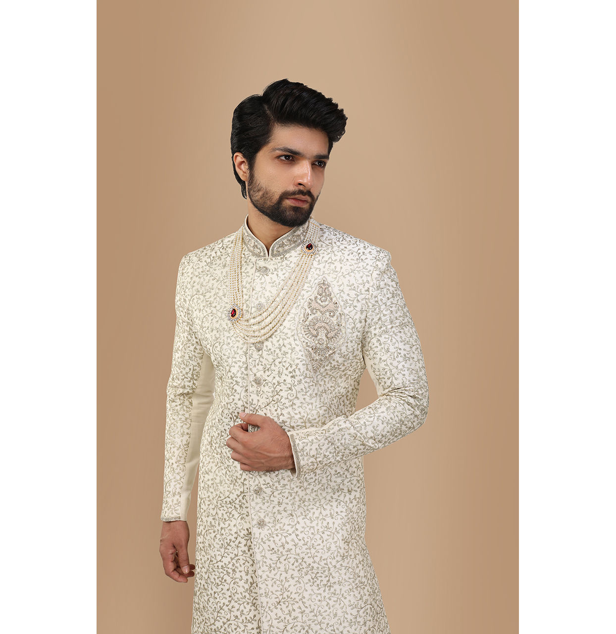 Warm White Art Silk Floral Jaal Textured Wedding Sherwani Set by Manyavar at Pernia s Pop Up Shop 2024 Very well made.