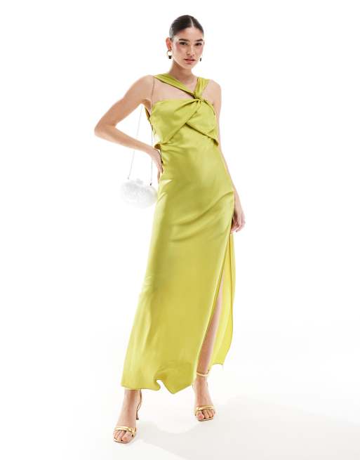 ASOS DESIGN Vestito lungo verde lime in raso drappeggiato con spalline incrociate Very well made.