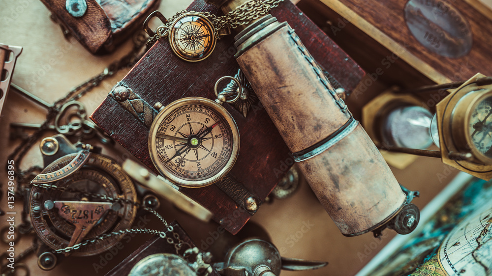 Antique compass old collection compass necklace and telescope on a wooden treasure box in vintage style image. Stock Photo Adobe Stock Very well made.