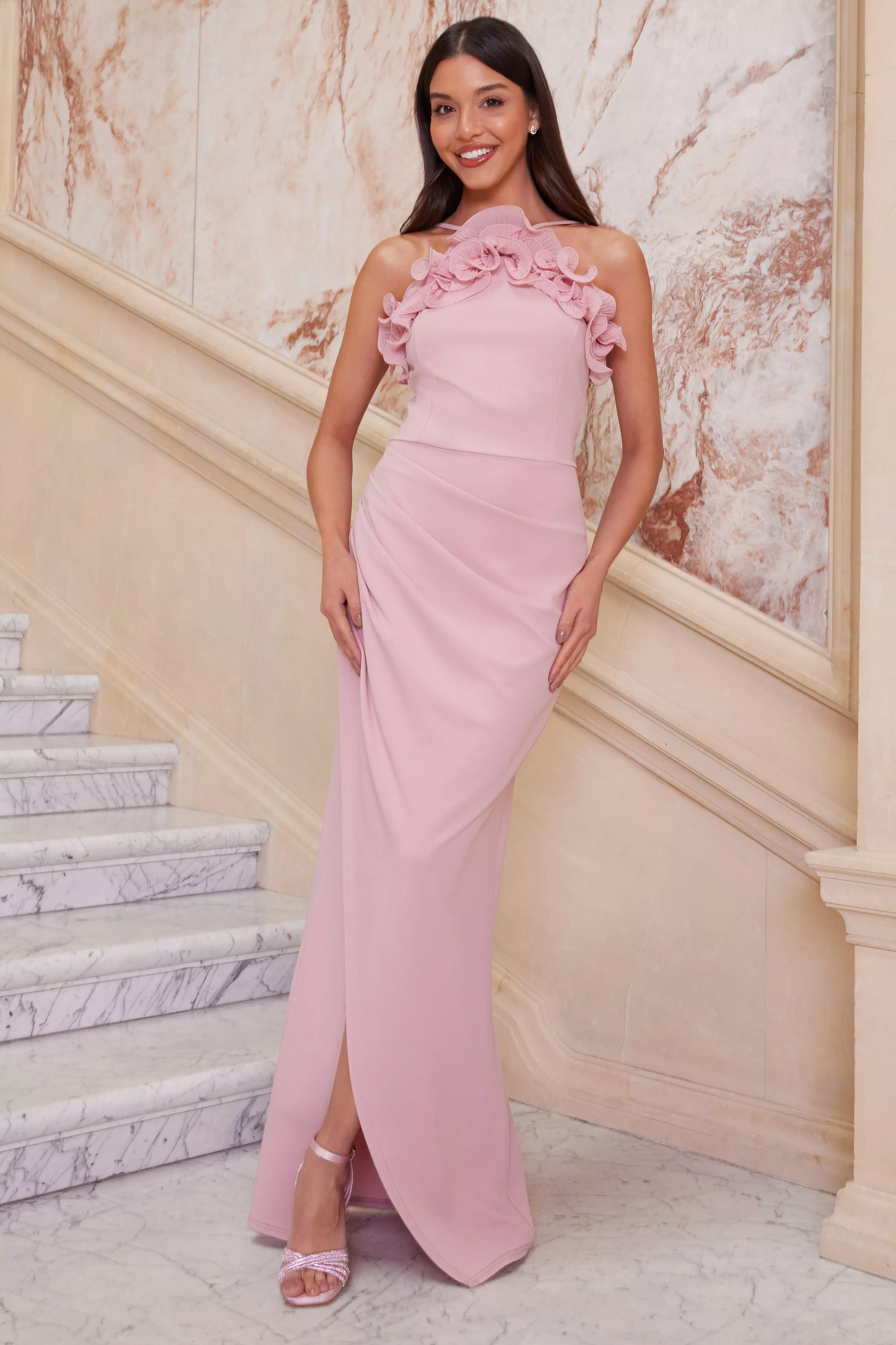 Blue Vanilla Pink Mesh Pleated Chiffon Gem Embellished Maxi Dress New Look Very well made.