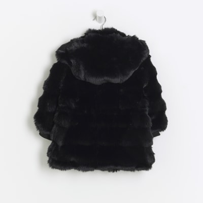 Mini girls black faux fur hooded coat River Island Very well made.