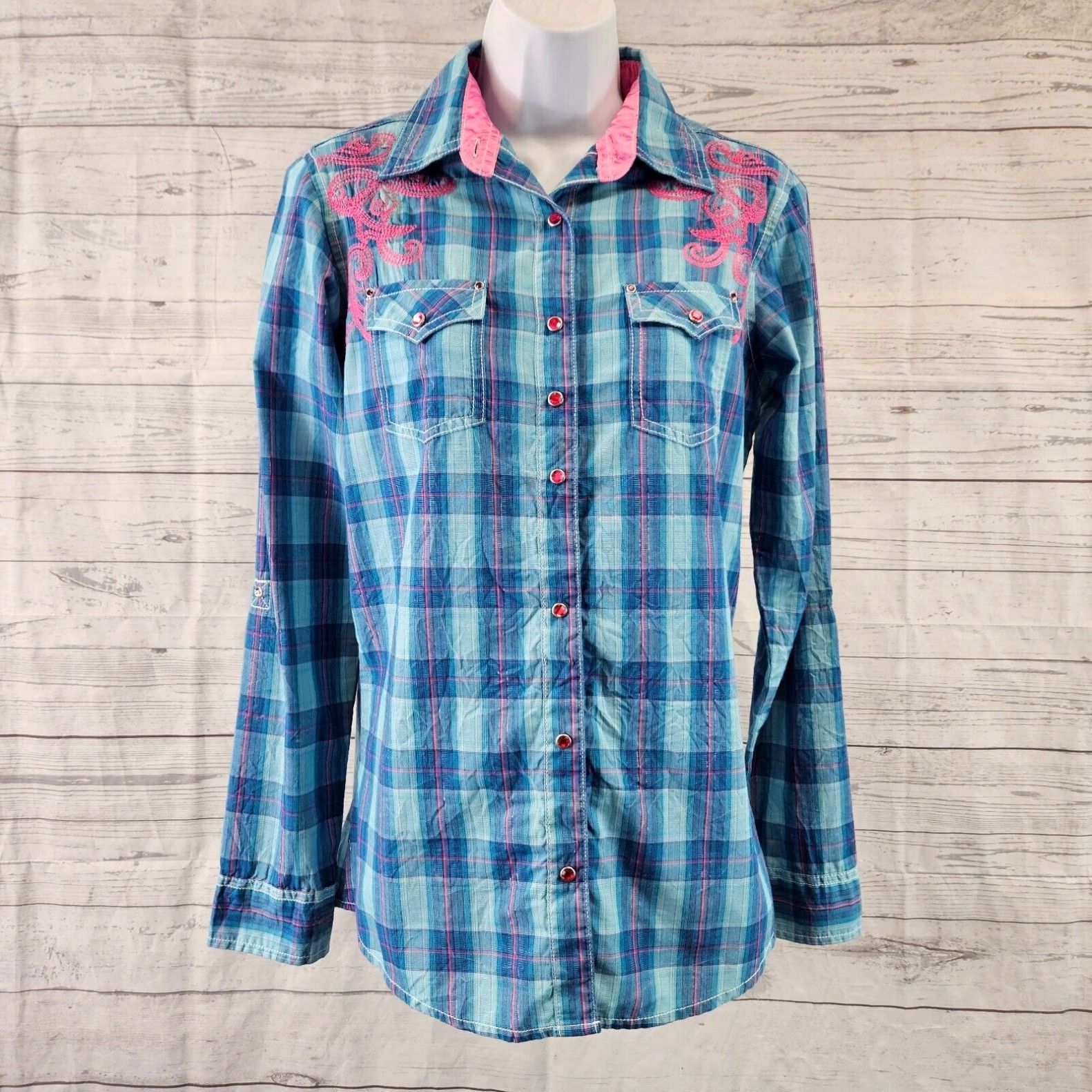 Wrangler Rock 47 by Wrangler Womens Pearl Snap Shirt Sz Small Blue Pink Embroidered Grailed Very well made.