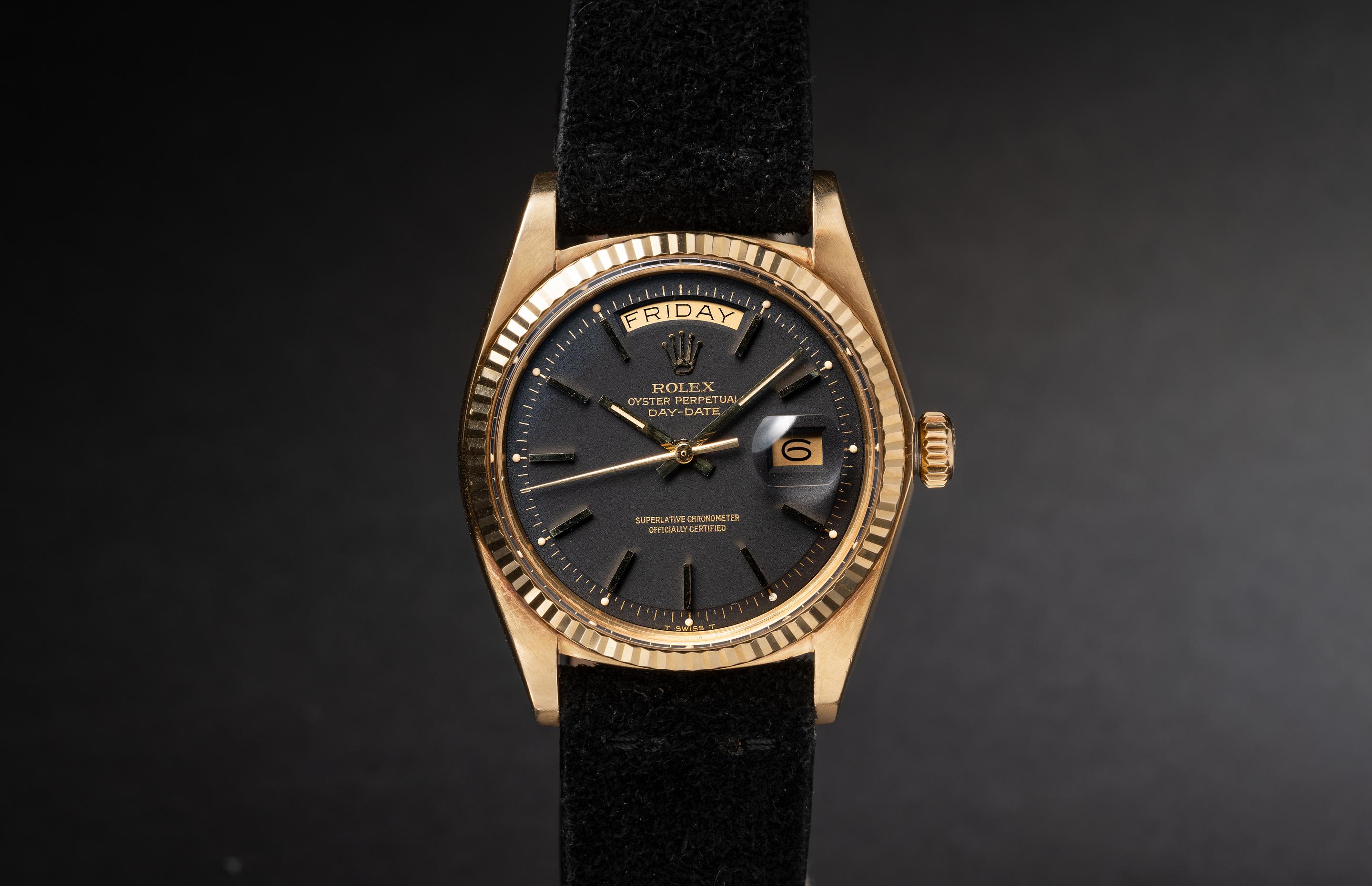 Tropical Watch 1974 Rolex 18K YG Day Date 1803 Matte Black Dial with Papers Very well made.