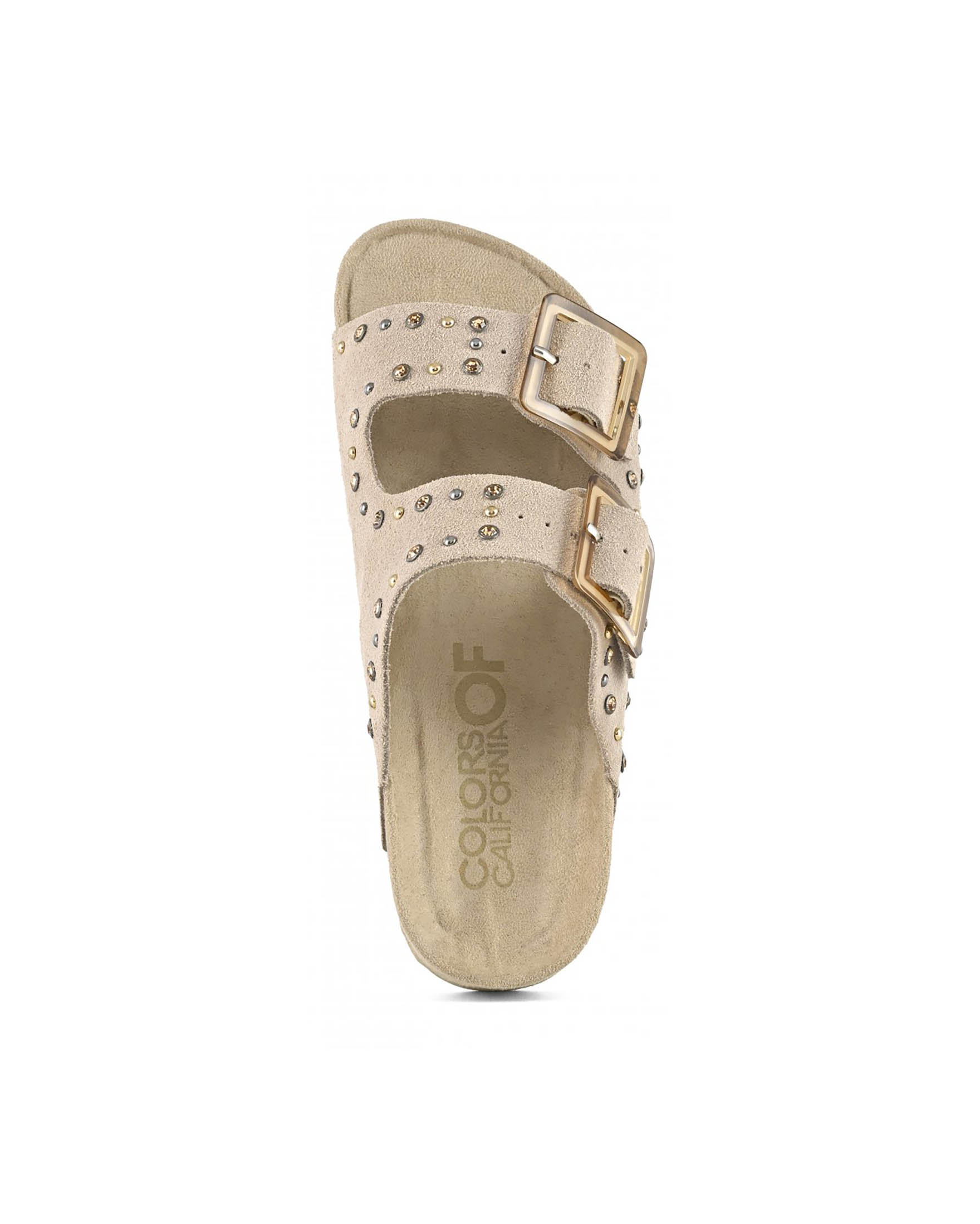 Sandali color sabbia in suede con doppia fascetta e borchie in metallo e strass applicati Very well made.