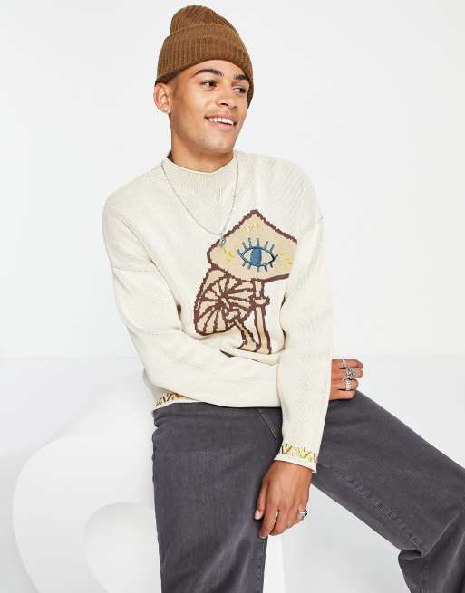 ASOS DESIGN jacquard knit sweater with mushroom and embroidery details in gray Very well made.