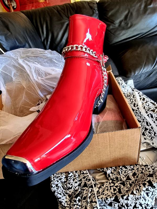 ASOS DESIGN cuban heel western chelsea boots in red patent with silver chain ASOS Very well made.