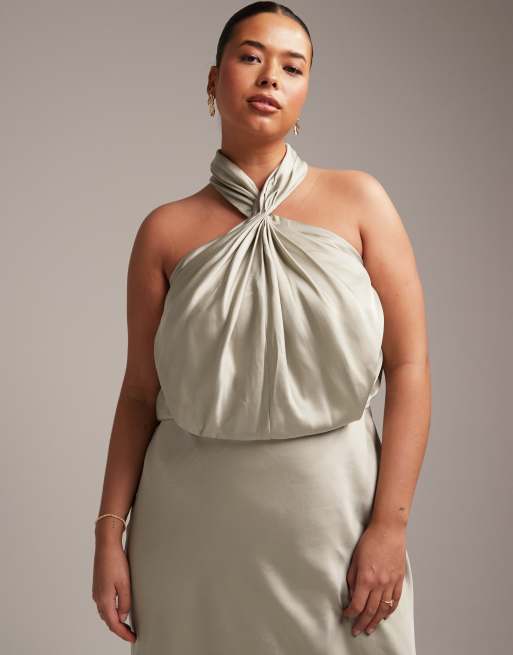 ASOS DESIGN Bridesmaid Curve satin ruched halter neck maxi dress in sage green Very well made.