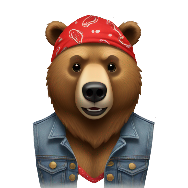 grizzly bear wearing sleeveless jean jacket and red bandana around head with open mouth emoji AI Emoji Generator Very well made.