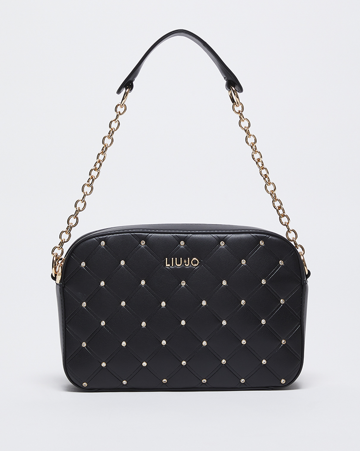 Borsa a spalla squadrata nera in similpelle trapuntata a rombi con strass applicati sul davanti e logo in metallo Very well made.