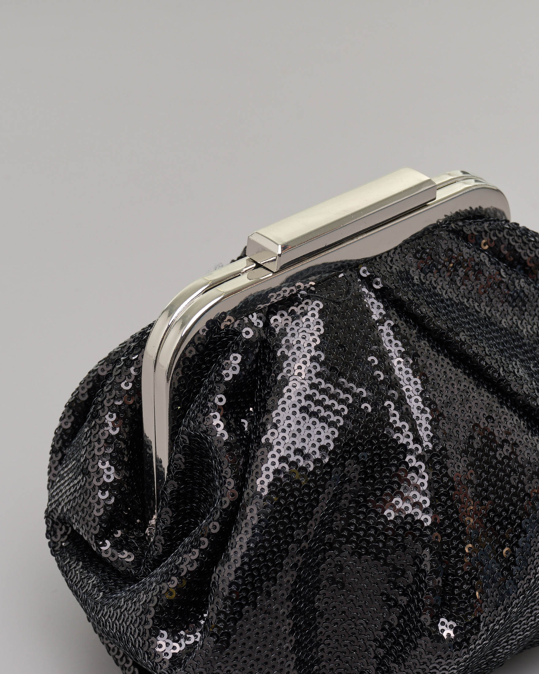 Clutch nera in paillettes con pieghe e chiusura a scatto in metallo Very well made.
