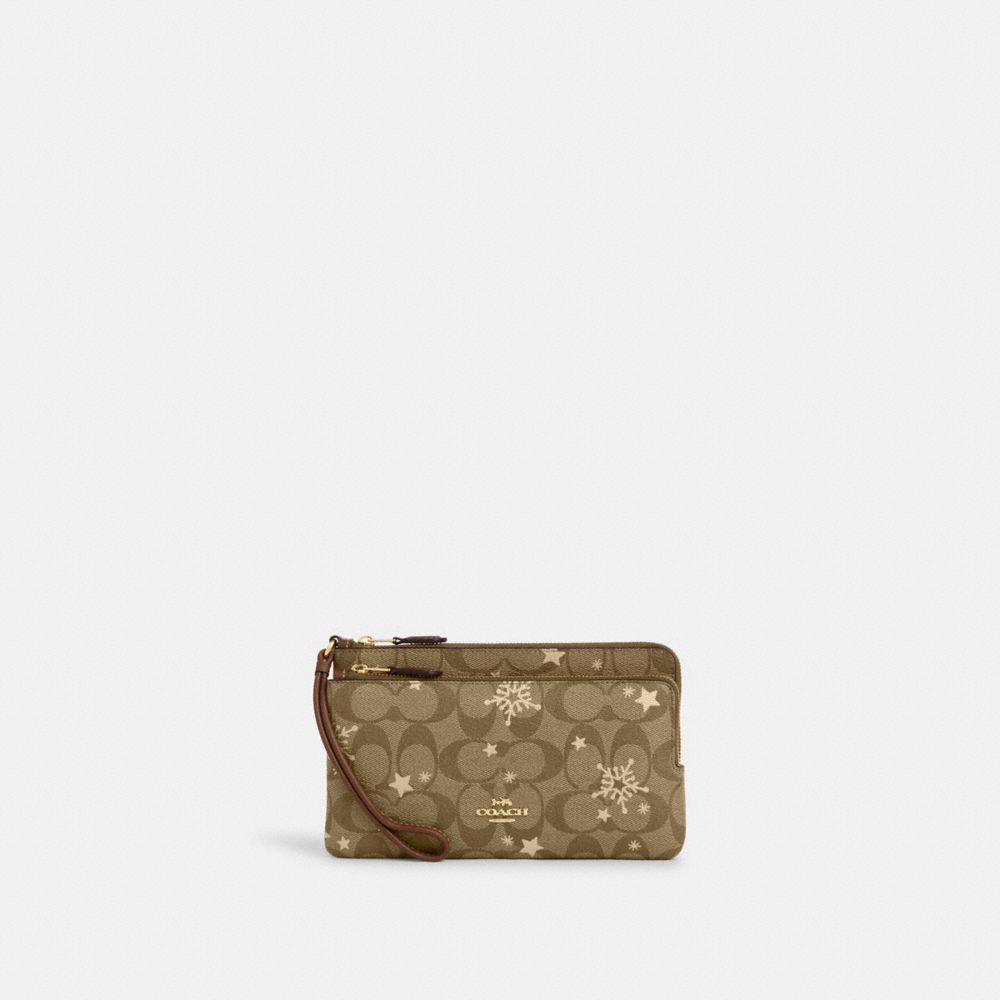 Gold Khaki Saddle Gold Multi Double Zip Wallet In Signature Canvas With Star And Snowflake Print Very well made.