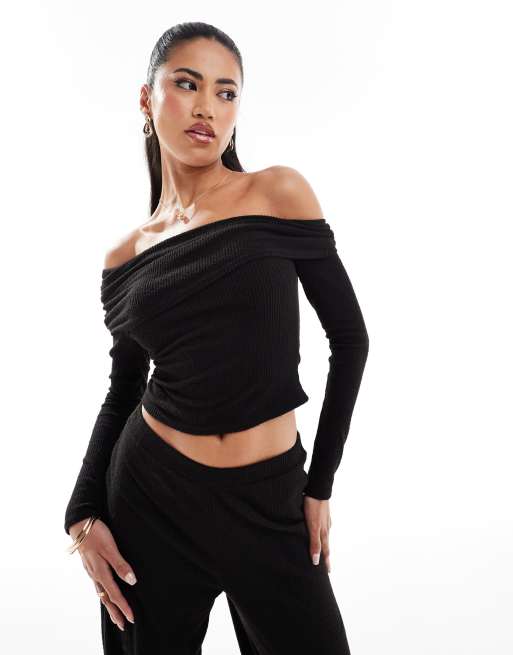 Kaiia slinky ruched bardot off shoulder top and wide leg pants set in black ASOS Very well made.