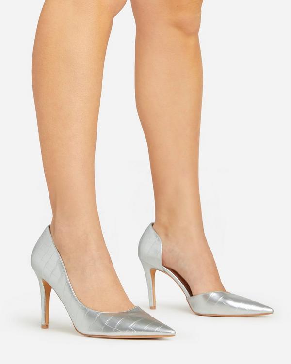 Petra Cut Out Side Detail Pointed Toe Court Heel In Silver Croc Print Faux Leather EGO Very well made.