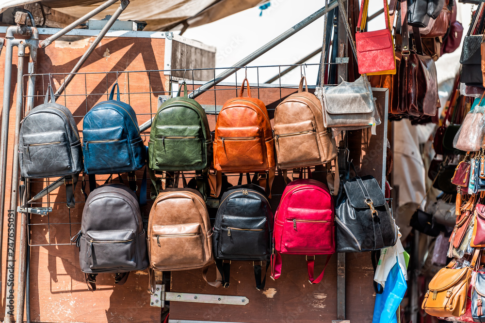 Florence Italy Many leather purse bags colorful vibrant colors hanging on display in shopping street market in Firenze in Tuscany Stock Adobe Stock Very well made.