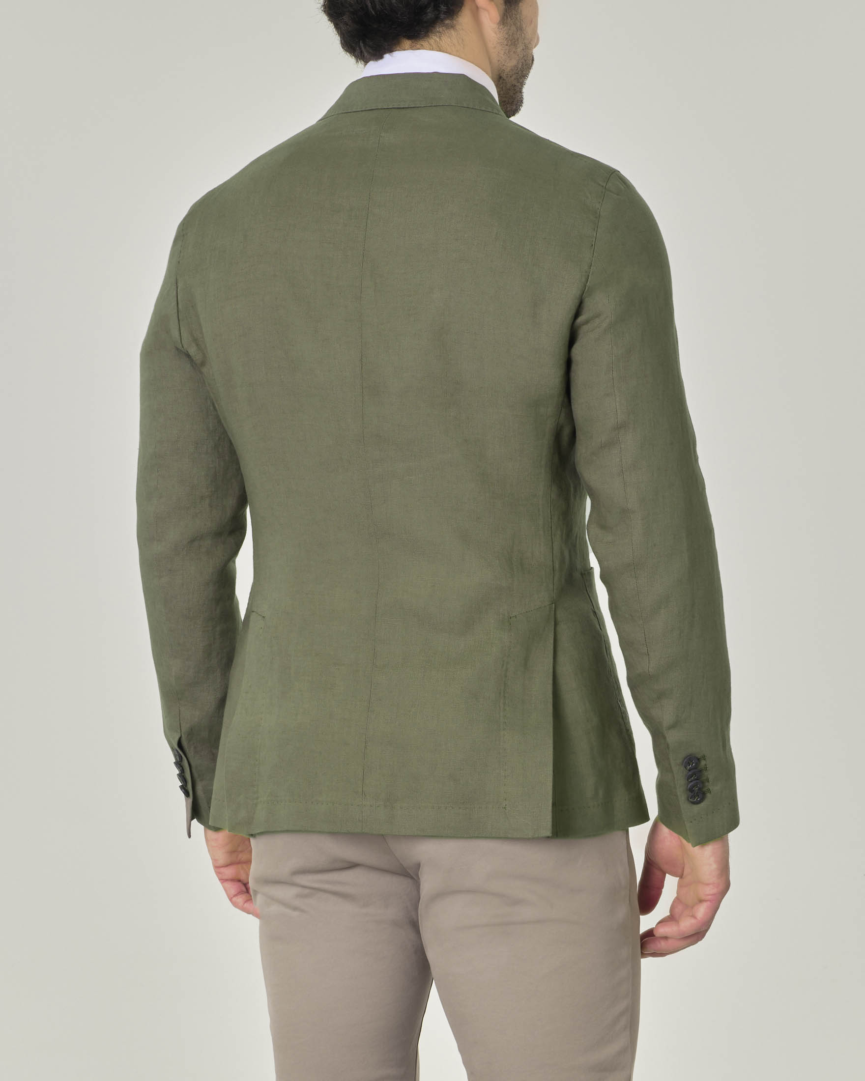 Blazer doppiopetto verde militare in puro lino con rever a lancia e tasche applicate Very well made.