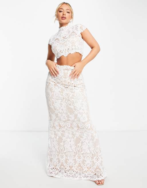 Goddiva Set a due pezzi bianco con crop top in pizzo e gonna lunga con coda di rondine Very well made.