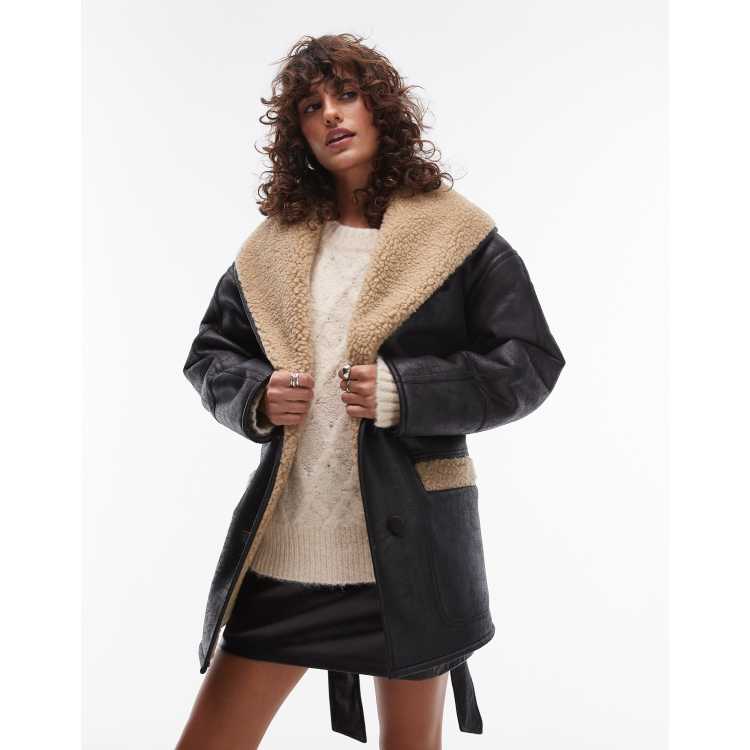 Topshop belted faux leather shearling jacket in black and cream Very well made.