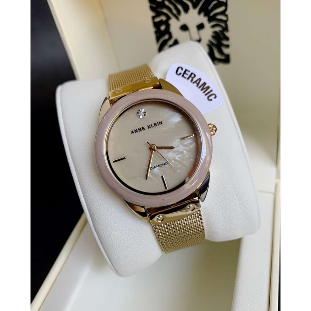 BNEW AUTHENTIC Anne Klein Watch 3258TNGB Diamond Tan Ceramic Gold Steel Mesh Watch For Women Very well made.