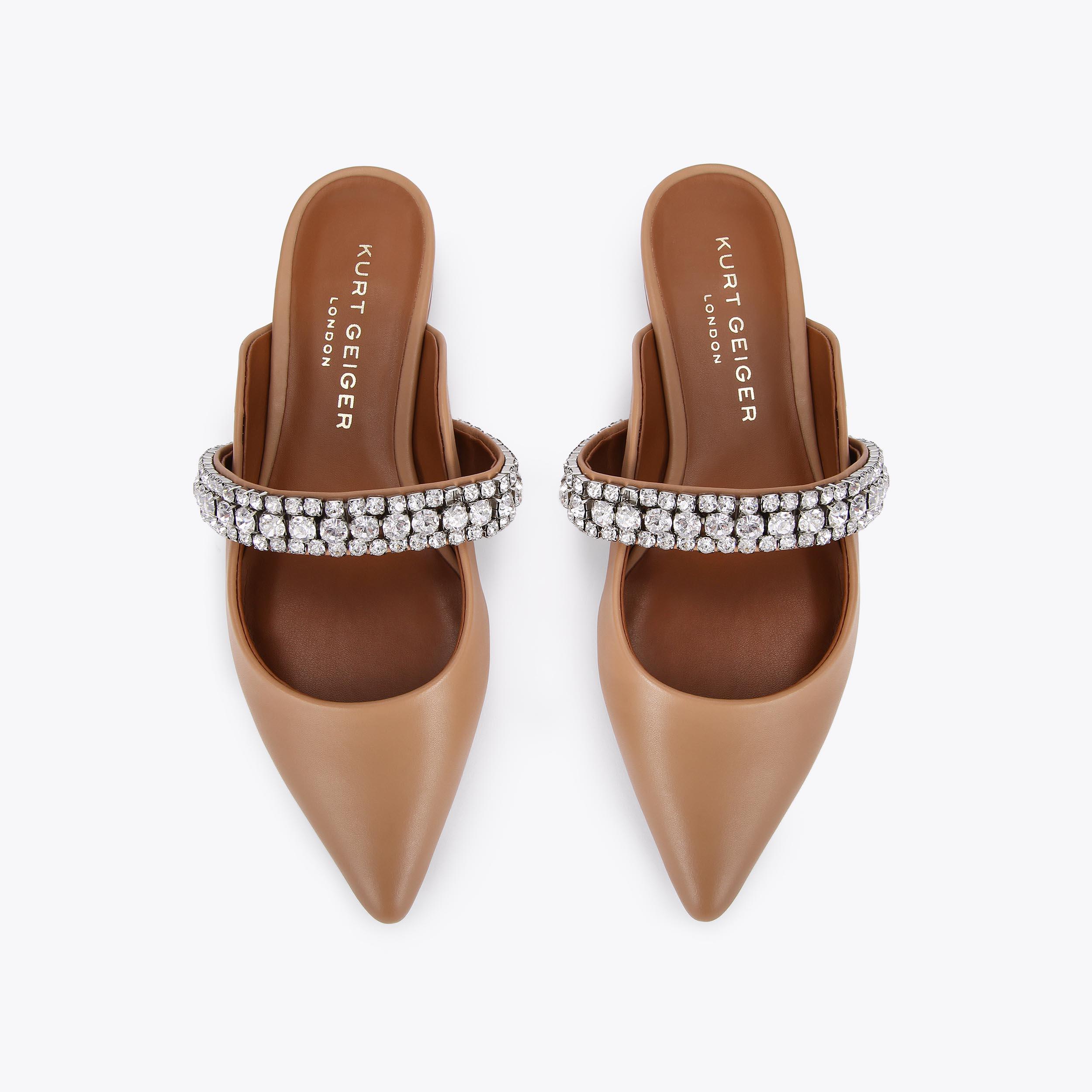 PRINCELY Camel Leather Crystal Strap Flat Mules by KURT GEIGER LONDON Very well made.