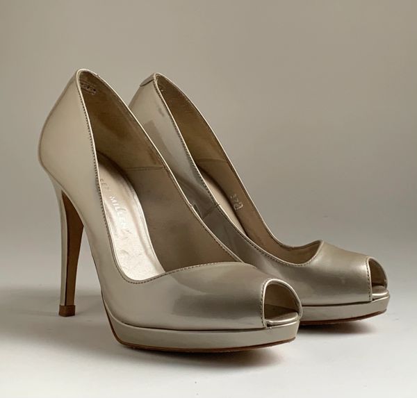 Karen Millen Metallic Neutral Leather Platform Peep Toe Shoes Box UK 4.5 Vintage Handbags shoes clothing Very well made.