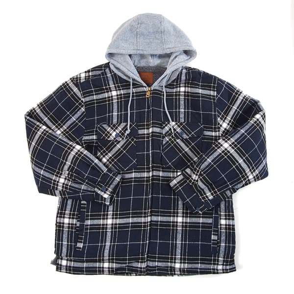 Mens Mountain Ridge Sherpa Lined Hooded Flannel Jacket Navy Black Boscov s Very well made.