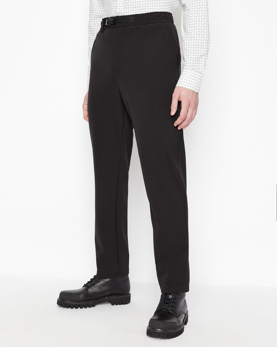 Pantaloni neri in tessuto tecnico stretch con coulisse a fibbia in vita Very well made.