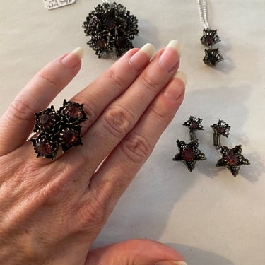 1960s costume jewelry Sarah Coventry parure amethyst rhinestones japanned 4 piece Black Label Vintage Tacoma WA Very well made.