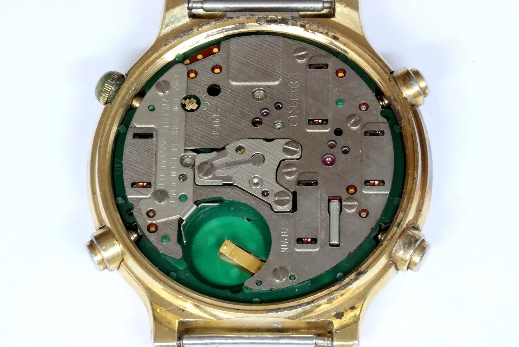 Seiko 7A34 7019 Chronograph Box Gold Quartz Mens Watch Authentic Working Japan Pre owned Vintage Very well made.