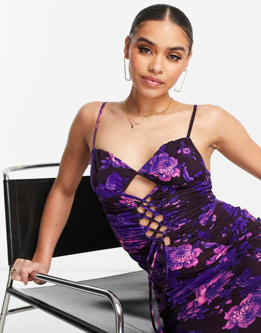 ASOS DESIGN cami lace up front ruched midi dress in purple floral print ASOS Very well made.