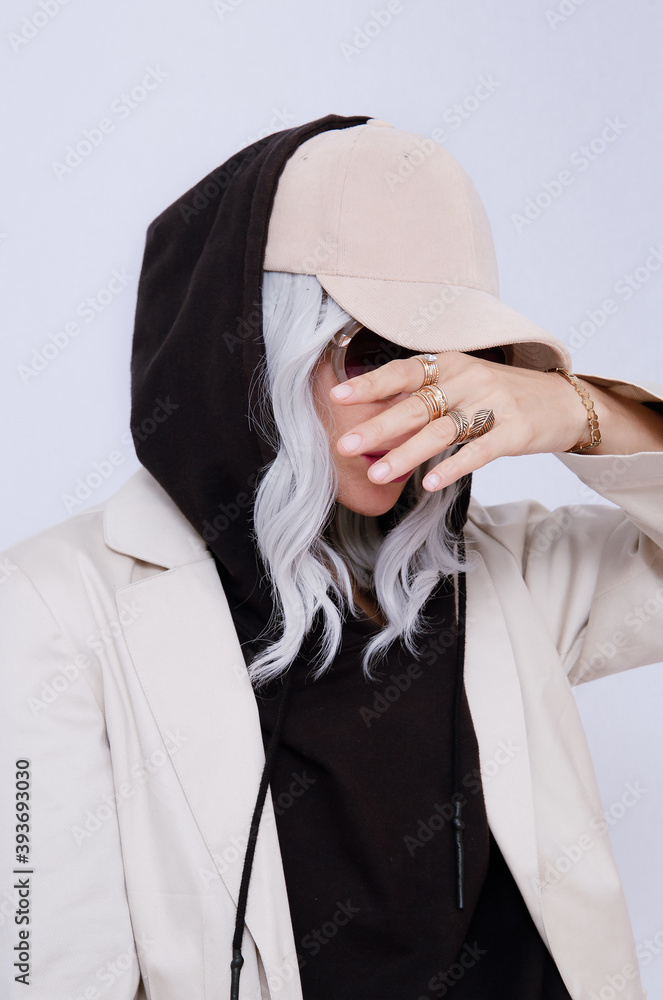 Blonde Girl in white studio. Trendy beige casual outfit with black hoodie details. Cap Denim Suit Jacket and Pants. Street Style. Fall winter season. Fashion lookbook concept Stock Photo Adobe Stock Very well made.