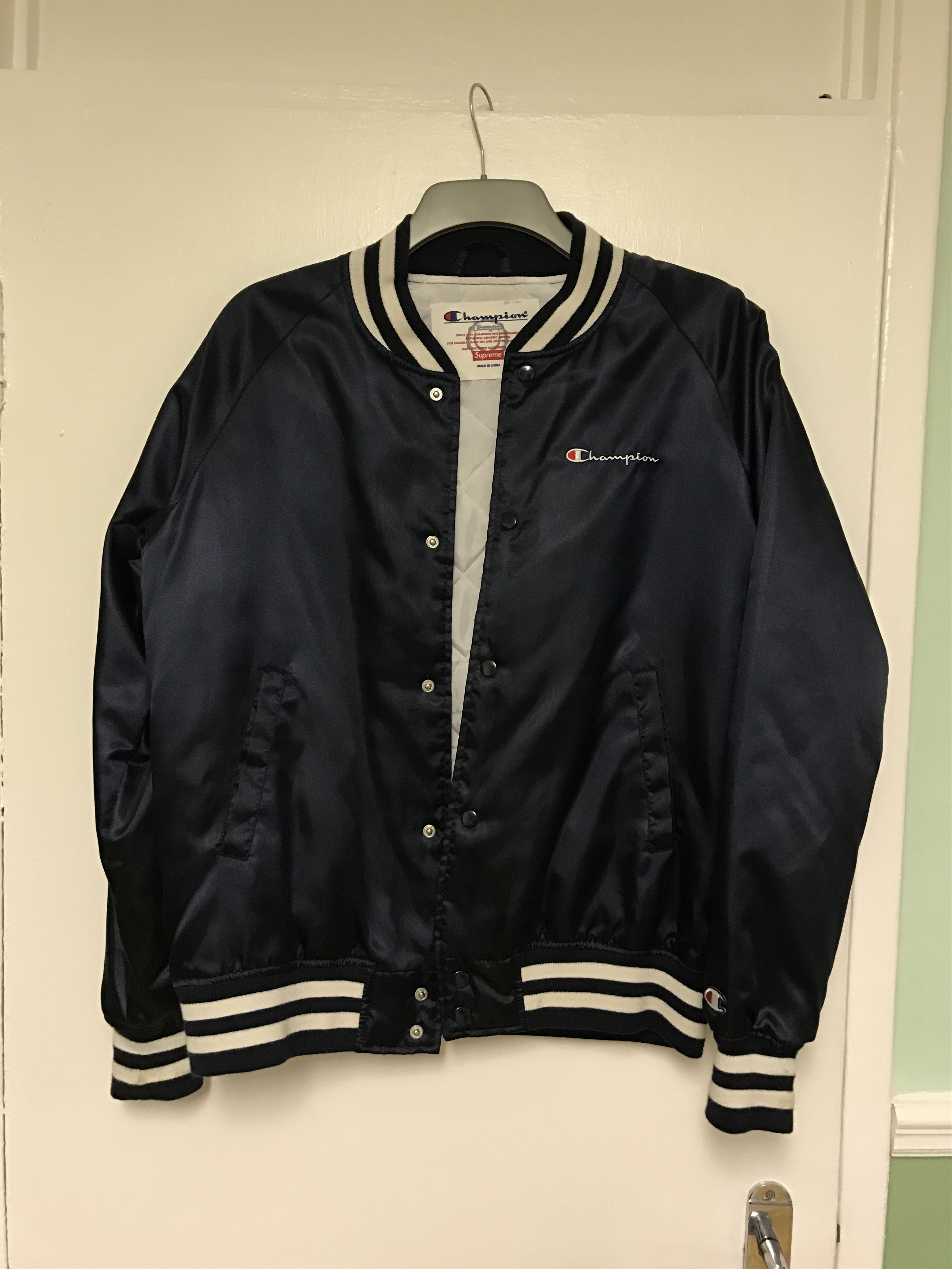 Champion Supreme SS13 Supreme Champion Satin Varsity Jacket Navy Grailed Very well made.