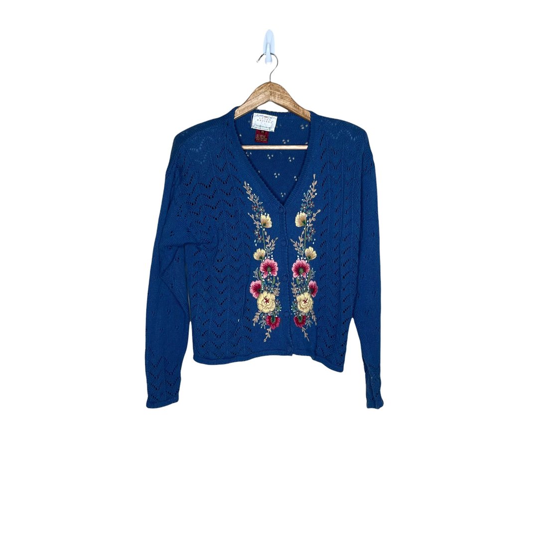 Vintage Susan Bristol Blue Embroidered Floral Cardigan Sweater Size M North Fork Vintage Kennesaw GA Very well made.