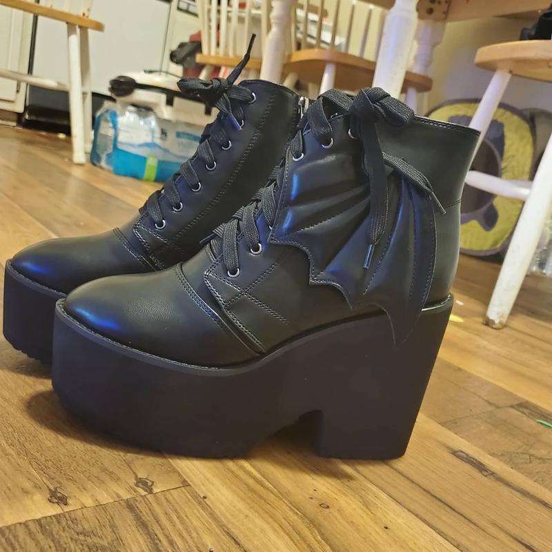 Yck SAiWed Womens Gothic Boots with Bat Wings High Heel Platform Lace Up Ankle Boots for Y2K Goth Lolita Cosplay Costumes Black 1 US 7 Amazon Clothing Shoes Accessories Very well made.