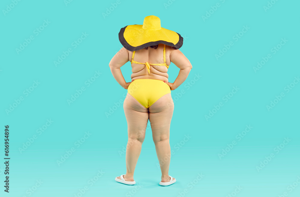 Back view fat woman in bikini and sunhat. Funny overweight plus size lady wearing yellow swimsuit Very well made.